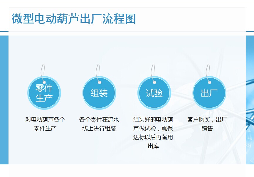 ?近期一些的用戶向我們做反饋,想要知道一些關(guān)于微型電動葫蘆方面的知識,更貼近的了解它的情況,今天我們就對電動葫蘆的出廠流程做解密,為了便于用戶了解,我們將以圖片的形式給大家做展現(xiàn)。